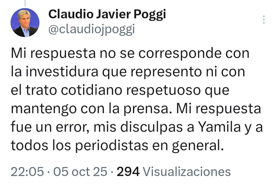“Mi respuesta no se corresponde con la investidura que represento ni con el trato cotidiano respetuoso que mantengo con la prensa. Mi respuesta fue un error, mis disculpas a Yamila y a todos los periodistas en general”, agregó.