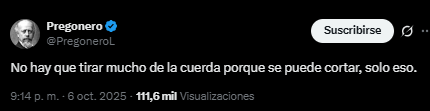 En redes sociales, el usuario Pregonero, una cuenta que el propio mandatario nacional suele citar mucho, se mostró crítico con el evento de Milei. “No hay que tirar mucho de la cuerda porque se puede cortar, solo eso”, dijo, sin dar muchos detalles ni mencionar a nadie, pero sí al mismo tiempo del acto.