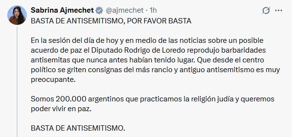 Para Ajmechet, De Loredo insinuó que su carrera política podría verse afectada por la “influencia de los judíos en los medios y el mundo empresario”. “Esa es la misma idea que está en los Protocolos de los Sabios de Sion, uno de los libros más antisemitas de la historia”, lanzó la legisladora de forma indignada. “Somos 200.000 judíos que vivimos en Argentina. Algunos tienen poder, otros no. ¿De qué estamos hablando?”, preguntó.