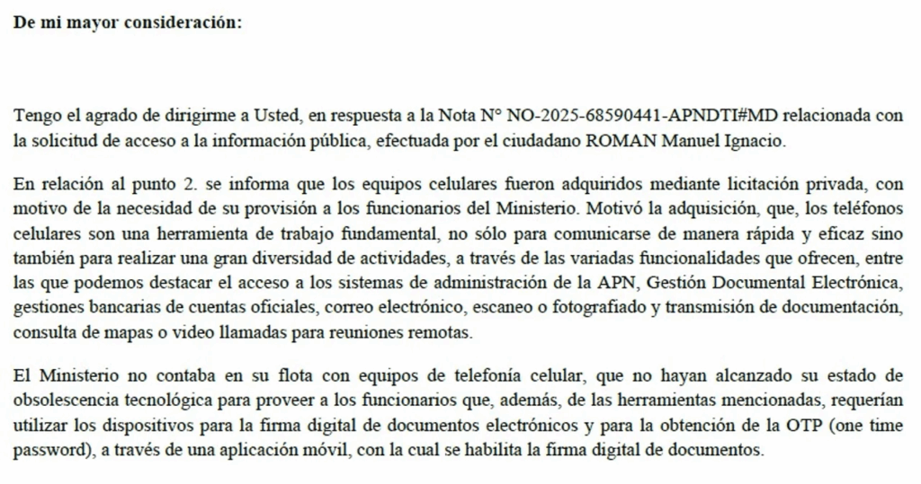 “El Ministerio no contaba en su flota con equipos de telefonía celular que no hayan alcanzado su estado de obsolescencia tecnológica”, explicaron y agregaron que “requerían utilizar los dispositivos para la firma digital de documentos electrónicos y para la obtención de OTP (one time password) a través de una aplicación móvil con la cual se habilita la firma digital de documentos”.