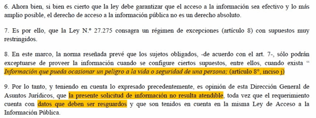 Con esto último, se puede interpretar que los dispositivos eran destinados a funcionarios altos. Sin embargo, evitó precisar quiénes lo recibieron basando su argumento en “la excepción prevista en el artículo 8°, inciso j), de la Ley N°27.275”, el cual da la posibilidad de no mencionar ciertos datos sobre la “información que pueda ocasionar un peligro a la vida o seguridad de una persona”.
