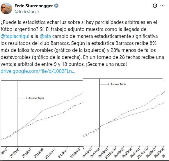 “¿Puede la estadística echar luz sobre si hay parcialidades arbitrales en el fútbol argentino? Sí. El trabajo adjunto muestra como la llegada de @tapiachiqui a la afa cambió de manera estadísticamente significativa los resultados del club Barracas”, expresó el ministro.