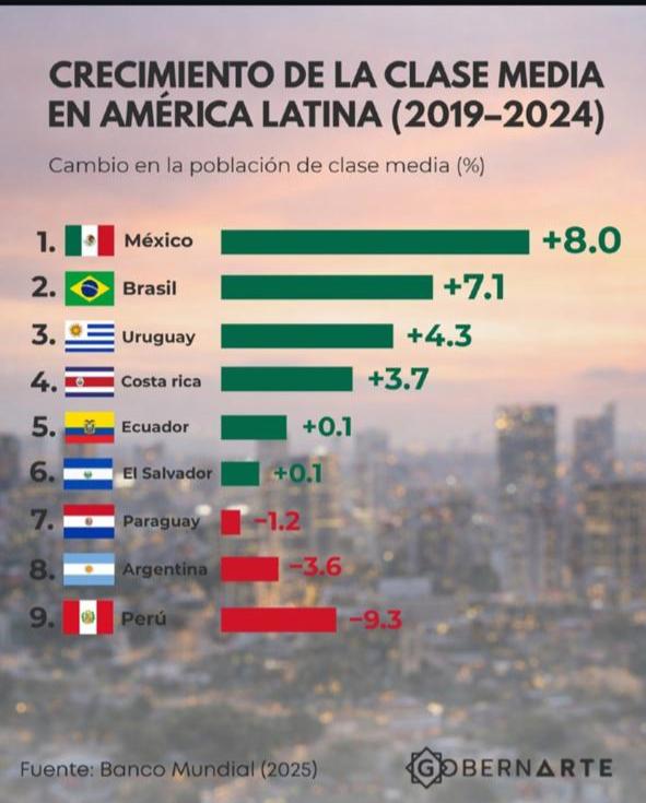 El dato surge de un relevamiento del Banco Mundial y contrasta de manera brutal con lo ocurrido en países vecinos. México lidera el crecimiento de la clase media con un avance del 8%, seguido por Brasil (+7,1%) y Uruguay (+4,3%). La región, en promedio, se mueve hacia arriba. Argentina, hacia abajo.