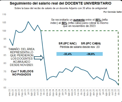 La pérdida del poder adquisitivo golpeó más a unos que a otros durante el gobierno de Javier Milei. Por caso, un informe señala que en dos años a los docentes universitarios les quitaron casi siete sueldos.