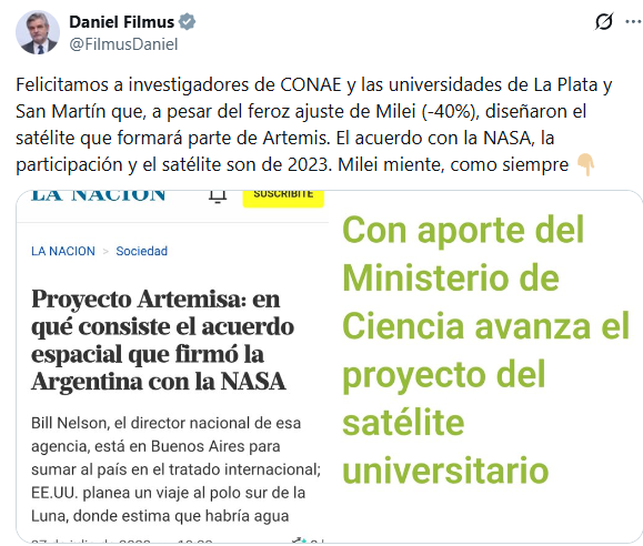 “Felicitamos a investigadores de CONAE y las universidades de La Plata y San Martín que, a pesar del feroz ajuste de Milei (-40%), diseñaron el satélite que formará parte de Artemis. El acuerdo con la NASA, la participación y el satélite son de 2023. Milei miente, como siempre”, dijo.