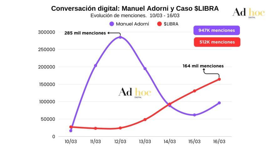 La consultora Ad Hoc mostró en un nuevo informe que el caso $LIBRA volvió a ganar su lugar en la conversación digital, con una relación directa con el presidente Javier Milei. Se dio luego de que una pericia judicial al celular del empresario Mauricio Novelli contradijera las explicaciones que dio el mandatario nacional.