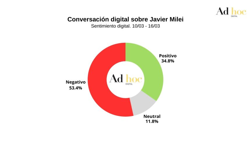 El relevamiento muestra que el sentimiento digital hacia Milei presenta una tendencia negativa. El 53,4% de las menciones sobre el mandatario son con un tono desfavorable, mientras que los comentarios positivos engloban el 34,8%.