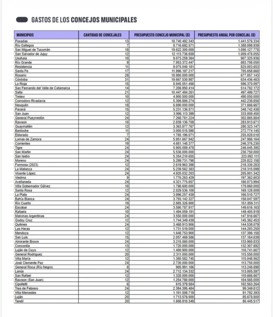 La Fundación Libertad Rosario elaboró un informe en el que armó un ranking de los Municipios de todo el país que más gastan en sus Concejos Deliberantes. La variable que se usó fue la de comparar el presupuesto anual destinado para cada concejal.