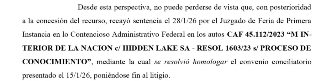 El entendimiento se dio en medio de la feria judicial. El 28 de enero dieron lugar a una sentencia en la cual se resolvió homologar el convenio conciliatorio entre Lewis-Hidden Lake y el Estado nacional.