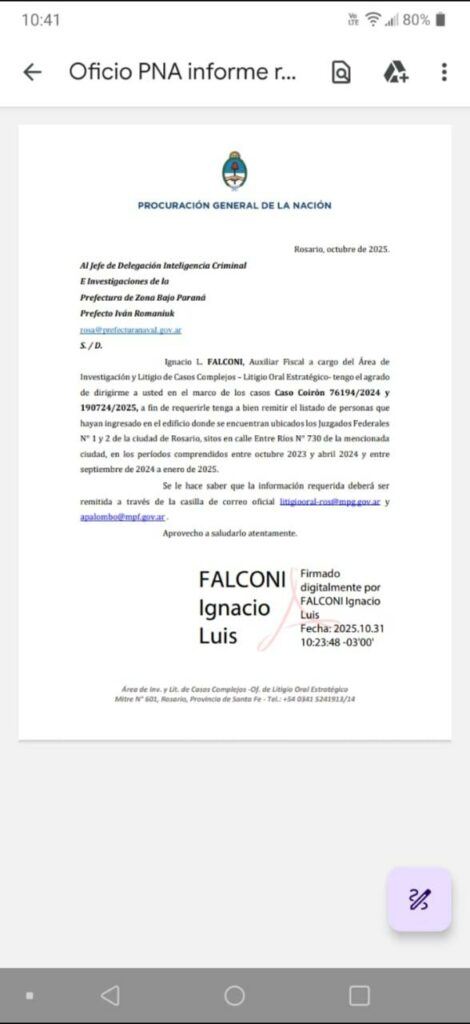 Según la documentación conocida en las últimas horas, la fiscalía federal de Rosario habría pedido a Prefectura que informara los ingresos de personas al edificio donde funcionan los juzgados federales N° 1 y 2 de Rosario, en una medida destinada a verificar una afirmación decisiva de un imputado colaborador, quien dijo haber concurrido en dos oportunidades al despacho de Salmain.